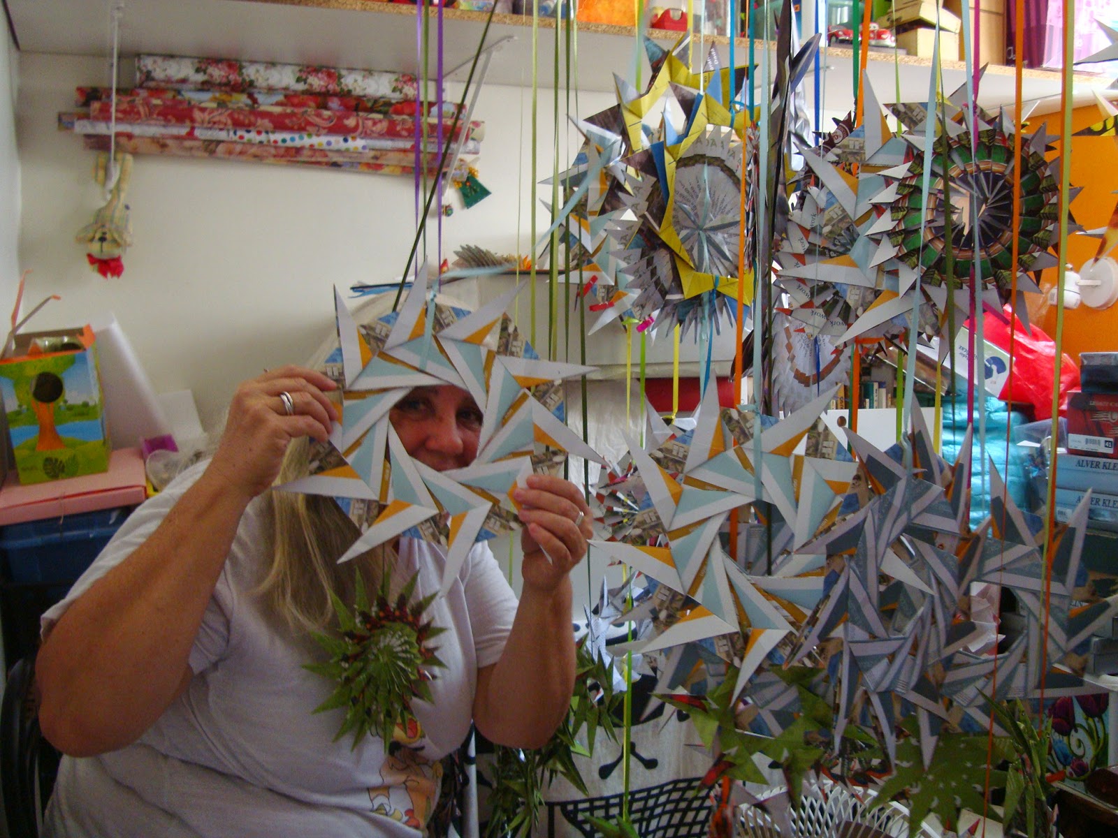 Instalaríamos 72 móbiles com número variado de mandalas nos janelões e mais 16 fios no círculo central. Todas autorais feitas com o módulo de InfinitOrigami ("Lego" em papel quadrado) e com triângulos e retângulos resultantes do corte dos catálogos e folhas, aproveitando assim inteiramente todos os papéis utilizados no projeto, sem desperdício ou perdas.